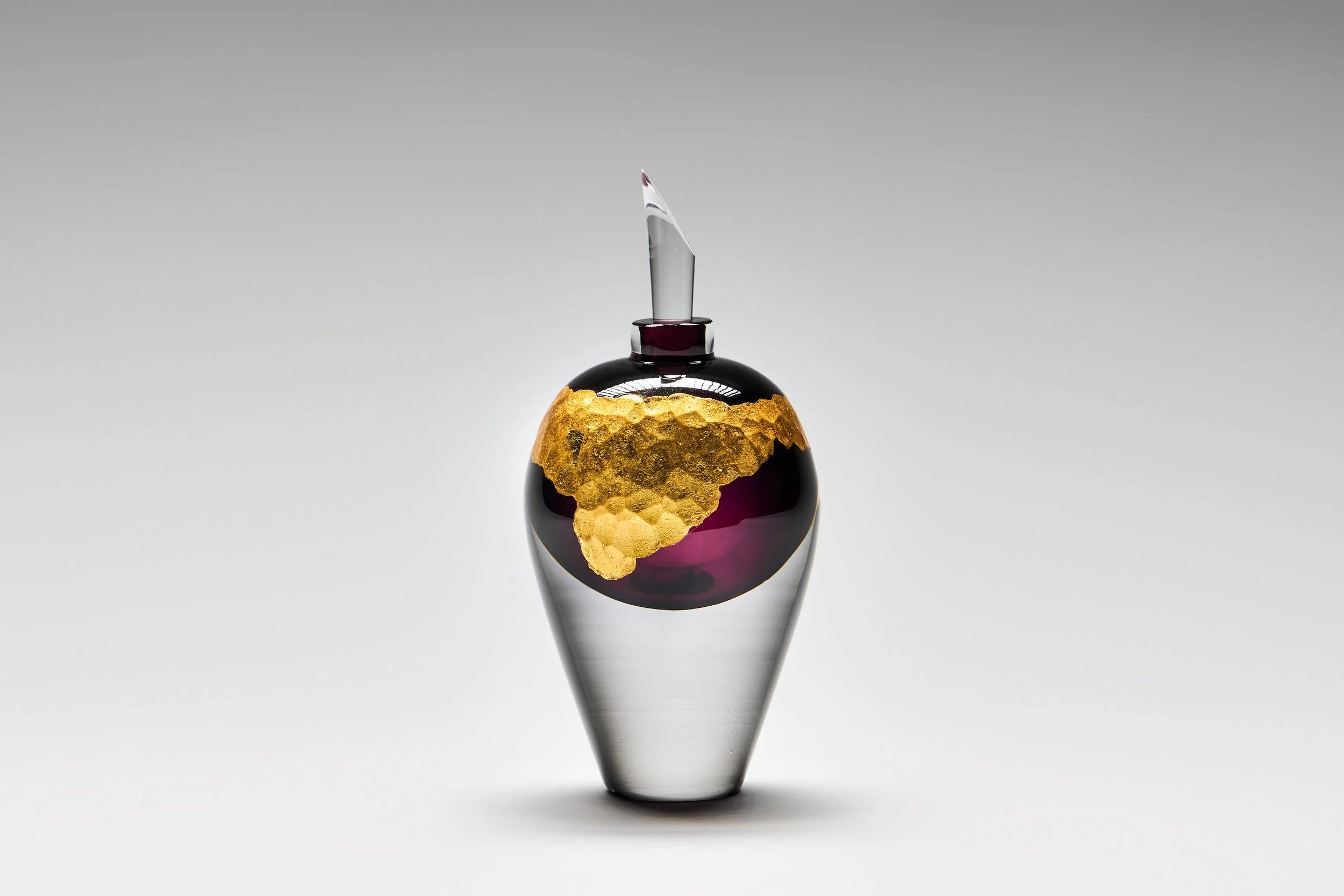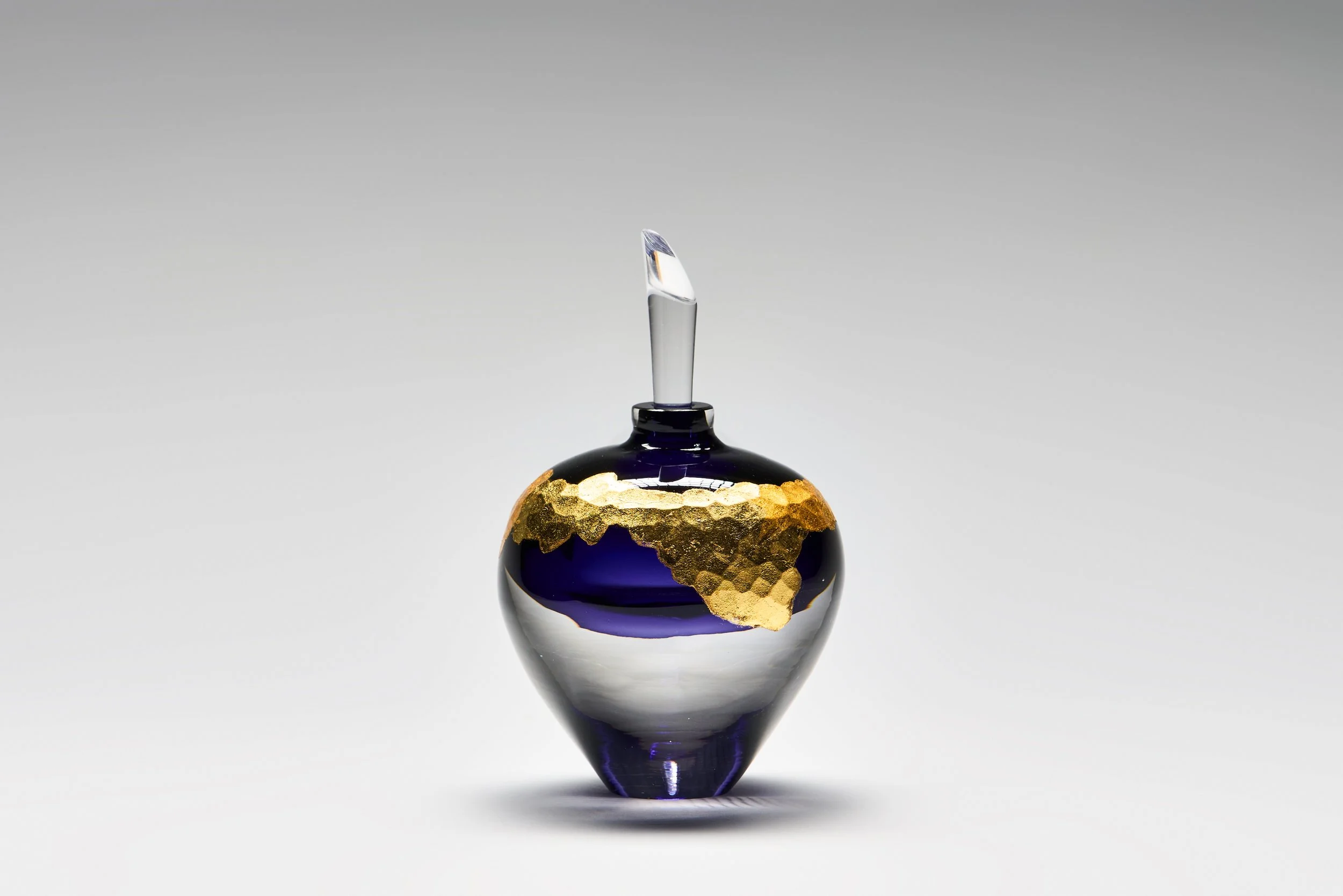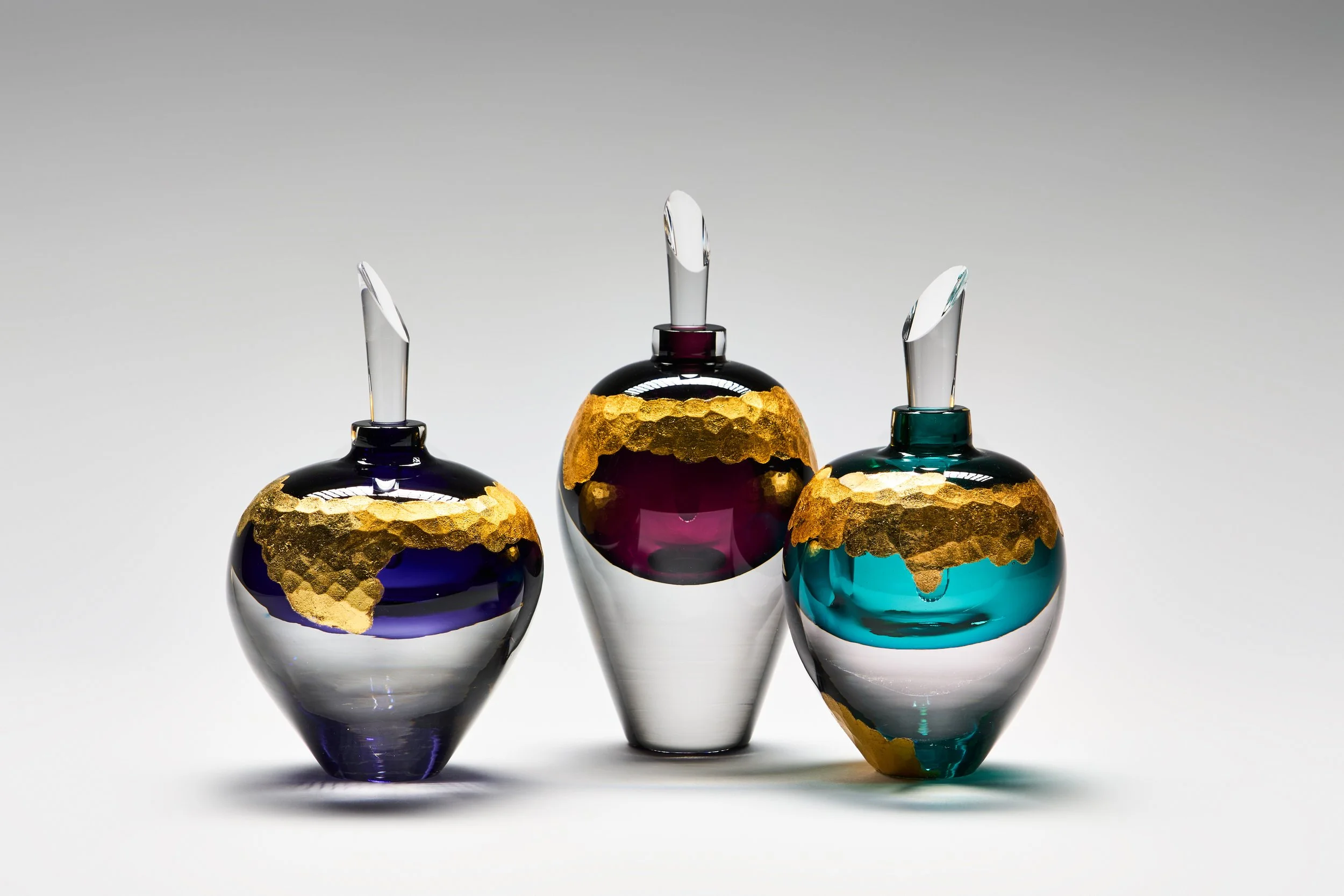 Aurum calls back to the ancient practice of alchemy and the desire to create gold from base metals. These pieces play on the fact that in glass, metals like iron, tin or cobalt are combined with the raw glass to produce a multitude of vibrant colours. The outside of the pieces are then gilded over a battutoed surface with gold leaf to evoke the look of hammered or planished metal. The vial-like shapes gesture to the assortment of vessels that alchemists used in pursuit of their impossible science. Each piece entwines the base with the precious in alchemical beauty.