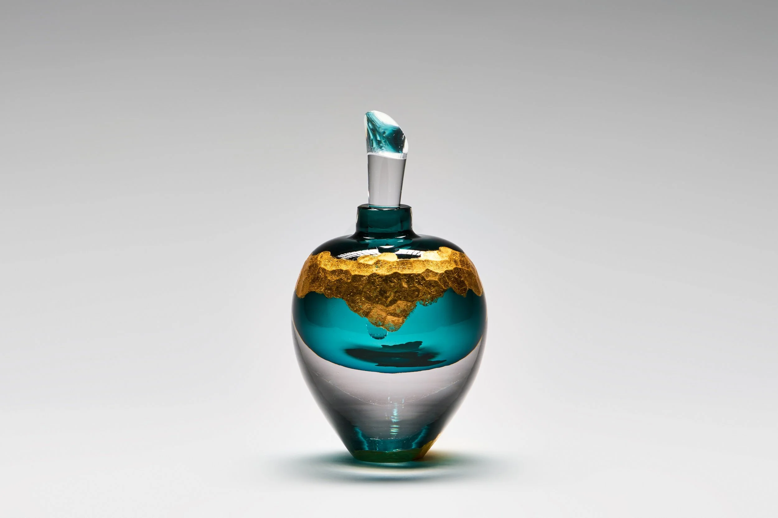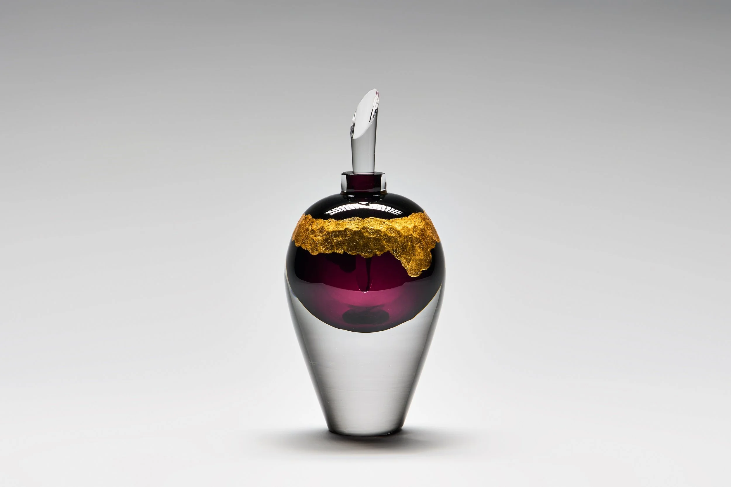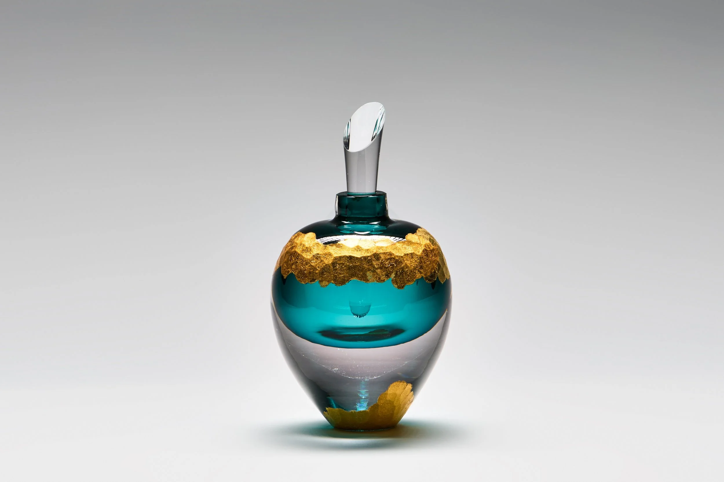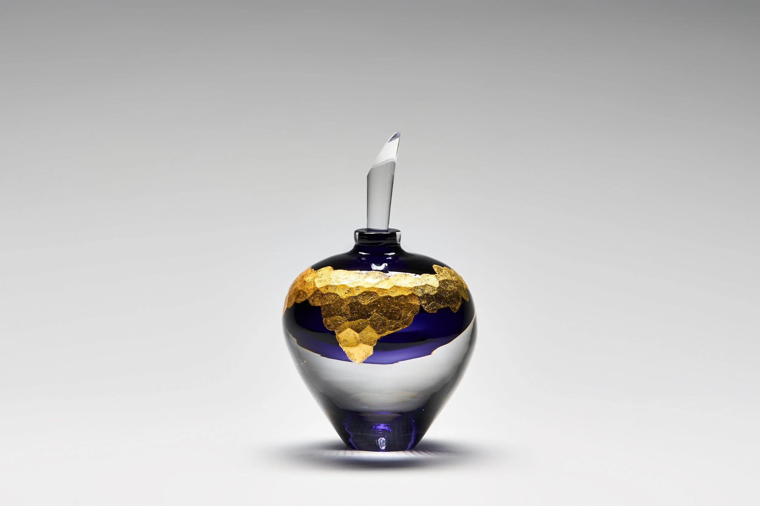 Aurum calls back to the ancient practice of alchemy and the desire to create gold from base metals. These pieces play on the fact that in glass, metals like iron, tin or cobalt are combined with the raw glass to produce a multitude of vibrant colours. The outside of the pieces are then gilded over a battutoed surface with gold leaf to evoke the look of hammered or planished metal. The vial-like shapes gesture to the assortment of vessels that alchemists used in pursuit of their impossible science. Each piece entwines the base with the precious in alchemical beauty.
