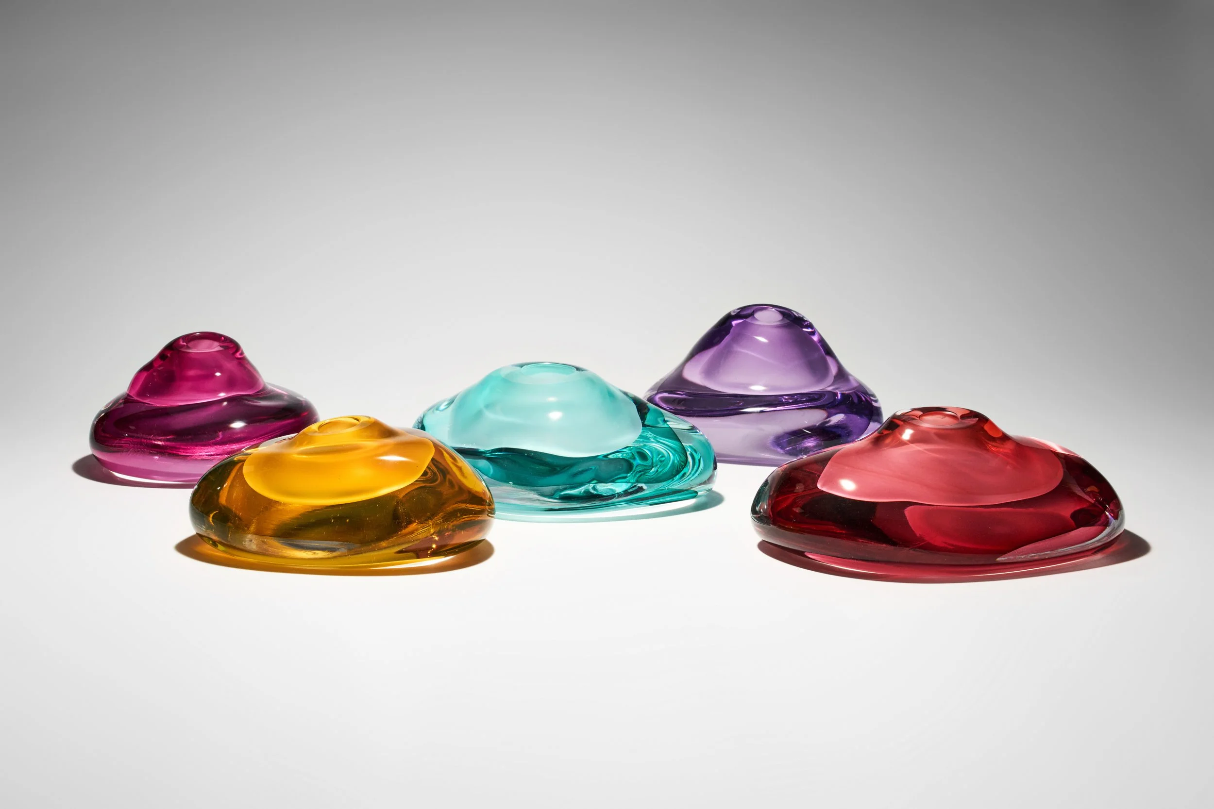 Despite being thought of as hard yet fragile, glass is incredibly malleable and pliable when hot. These soft and delicate forms are natural for the material before it cools into a solid and unyielding shape. The techniques used to colour and alter the surfaces of the glass further enhance this distortion, diffusing and dispersing the light as it enters the internal space through the soft ‘floating’ colours.