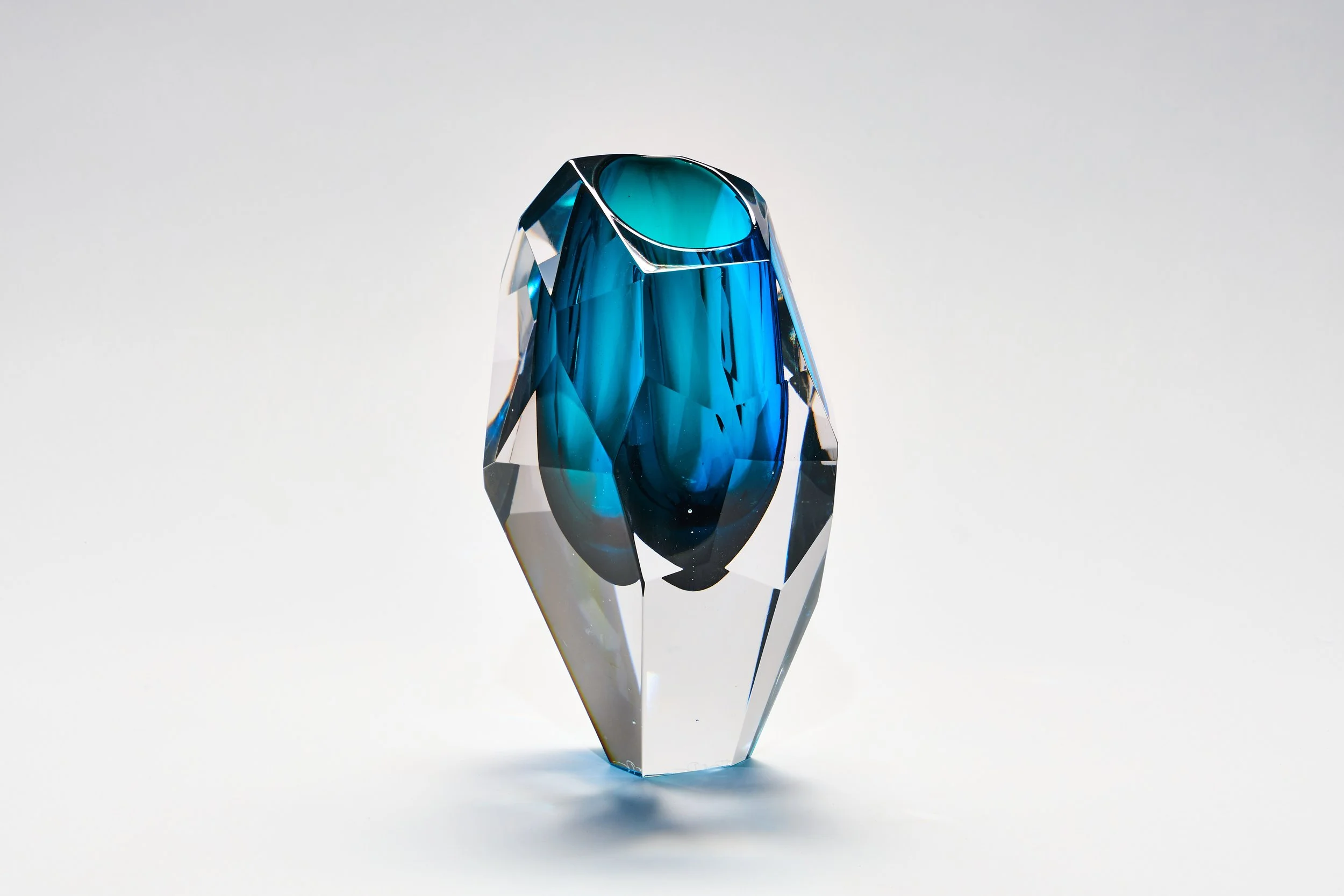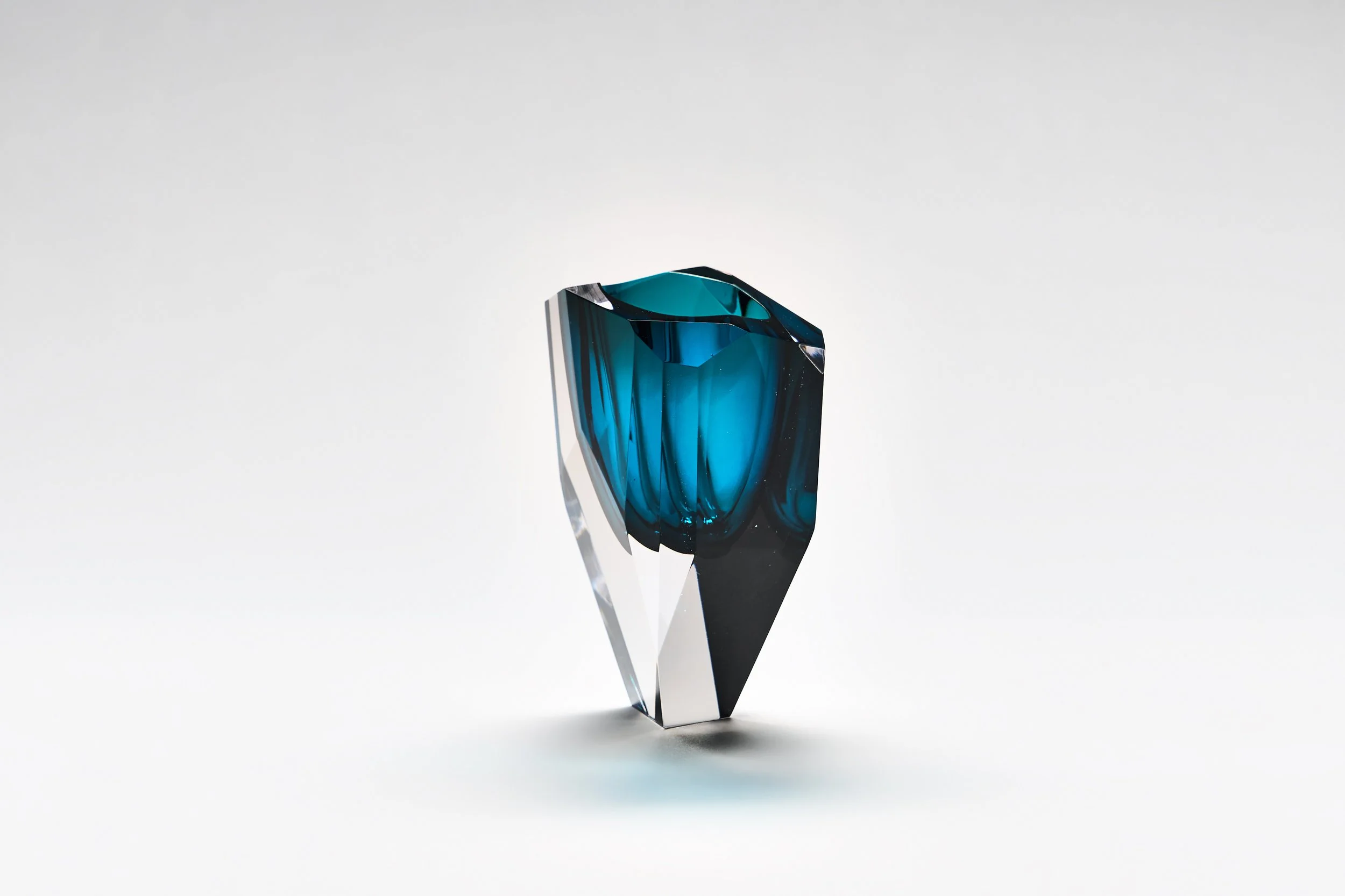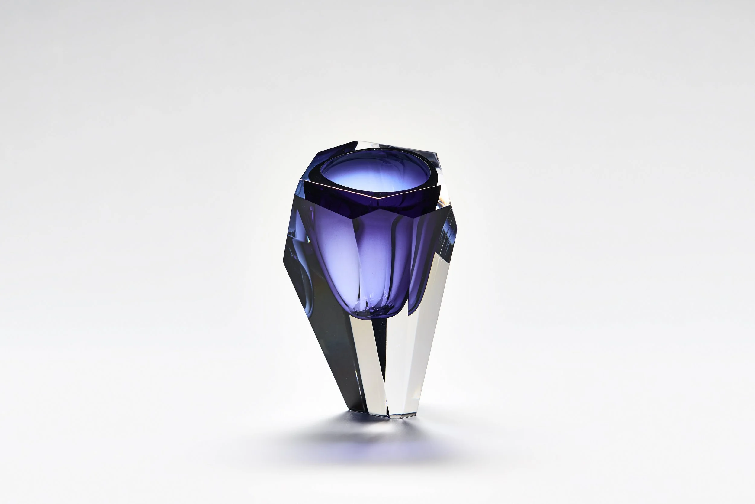 Refracted encourages the viewer to physically engage with the work, moving around it to get multiple angles and perspectives. By hand cutting the surface of each piece to form facets, light is refracted around the work, bouncing around the internal space and distorting both the colour and shape of the piece. Similar colour tones are combined to create hues that resist categorisation, rendering each work unique.