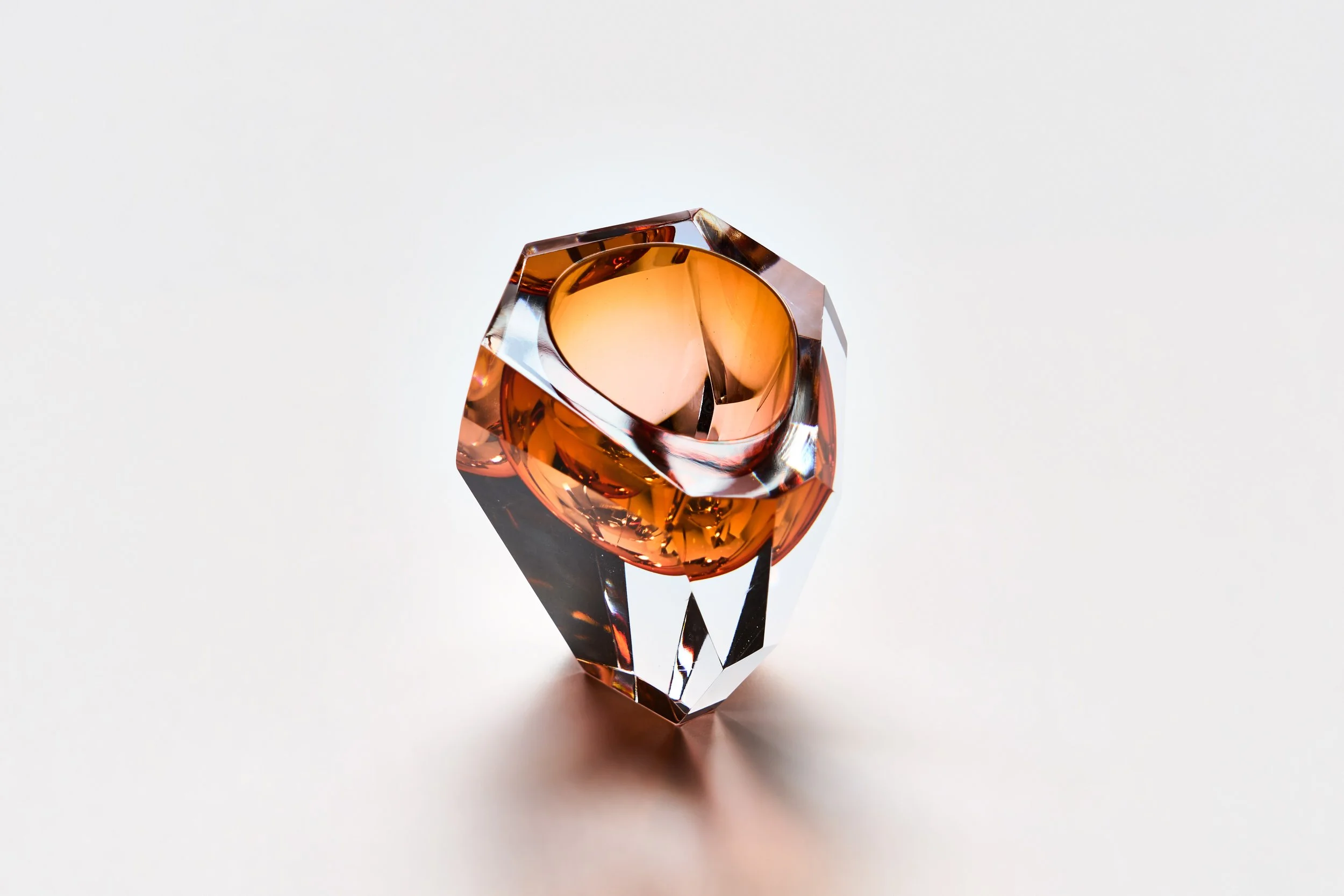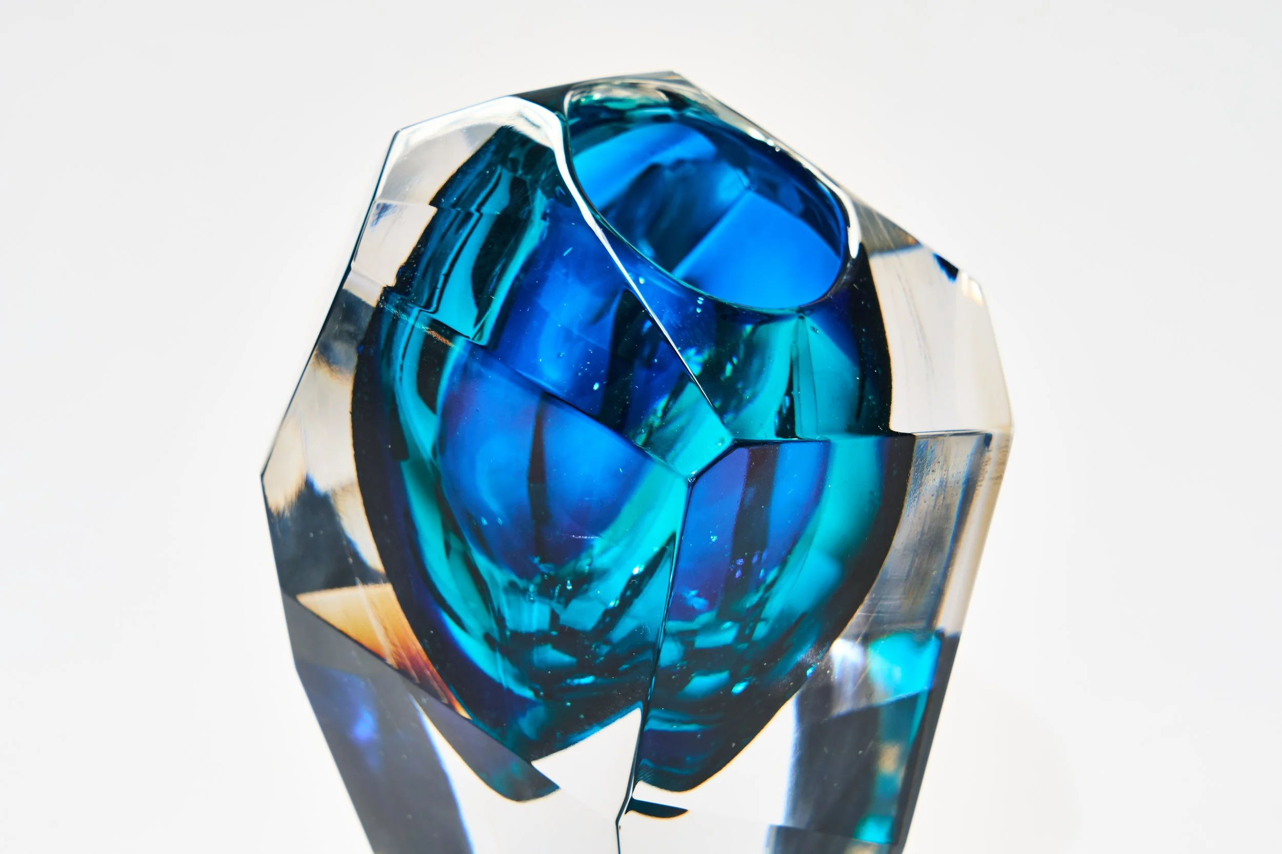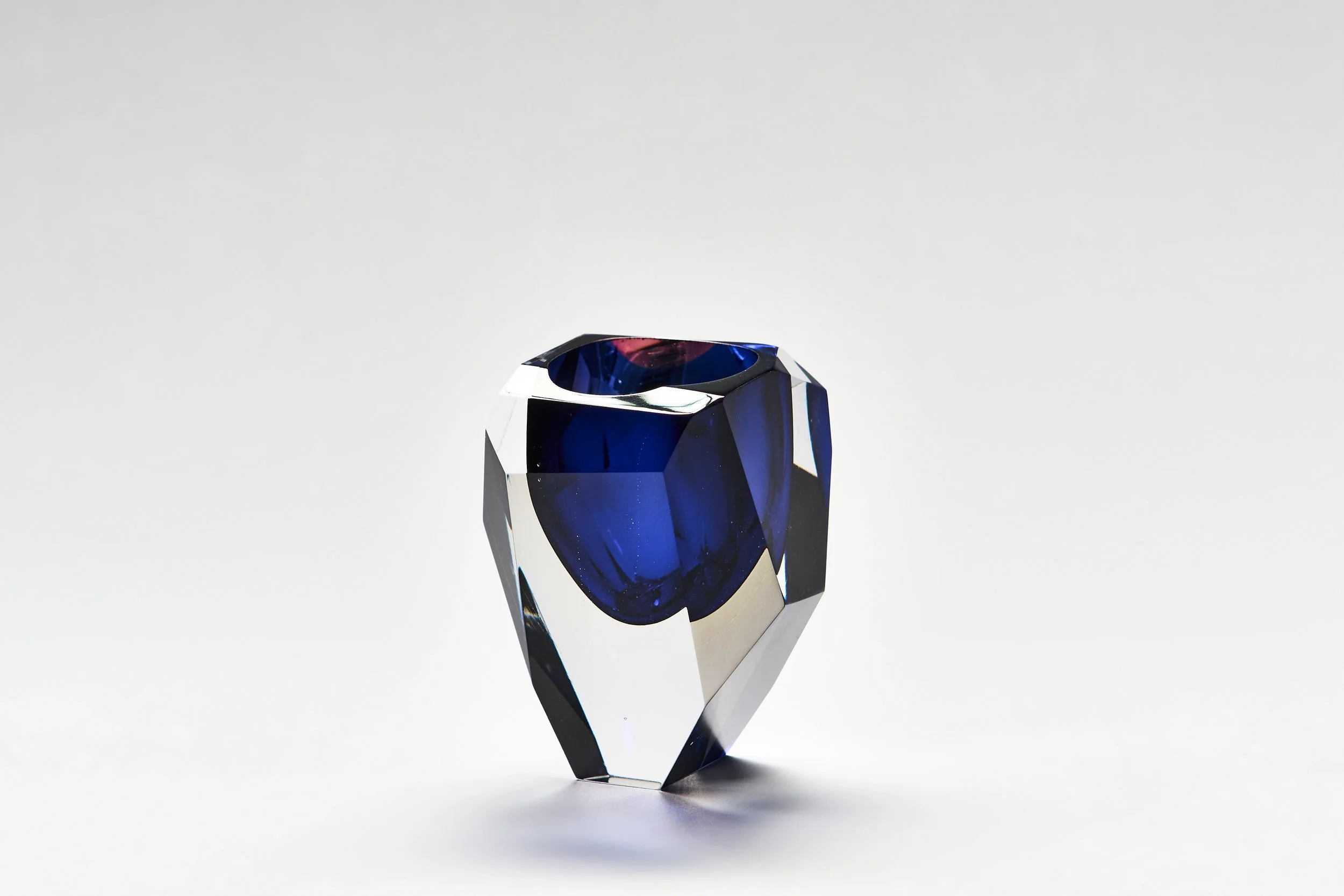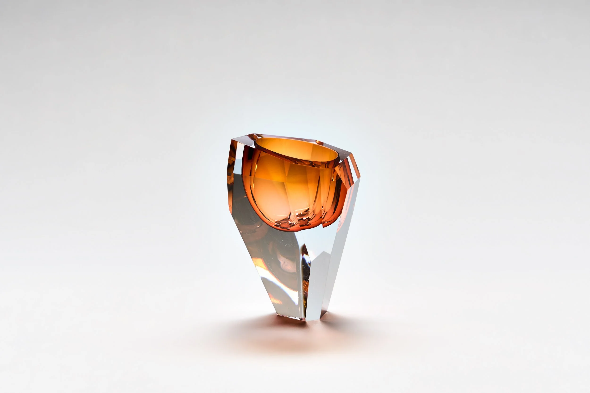 Refracted encourages the viewer to physically engage with the work, moving around it to get multiple angles and perspectives. By hand cutting the surface of each piece to form facets, light is refracted around the work, bouncing around the internal space and distorting both the colour and shape of the piece. Similar colour tones are combined to create hues that resist categorisation, rendering each work unique.